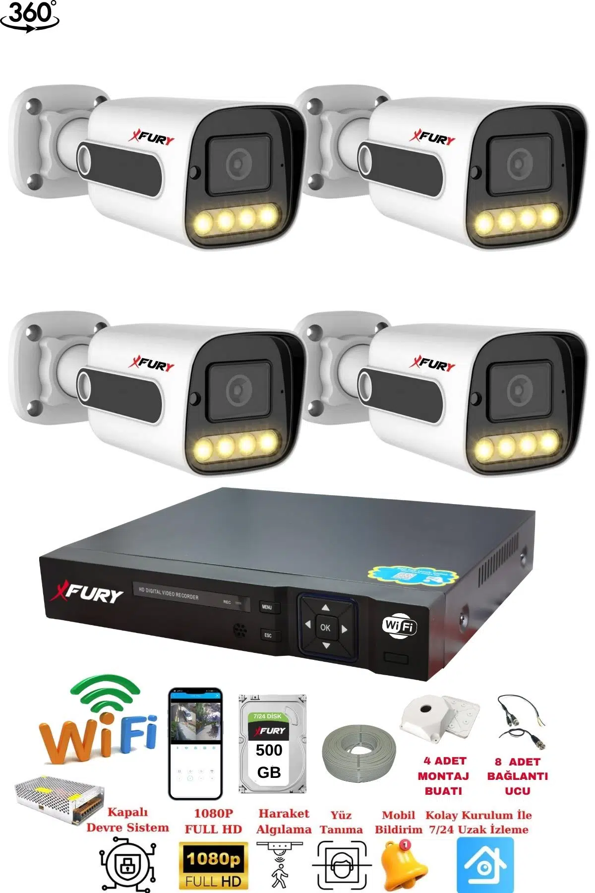 | Etiketler | FURY 4 Kameralı Su Geçirmez 1080P 4 x Ultra Ledli Gece Renkli Güvenlik Kamera Seti 5500 500GB |