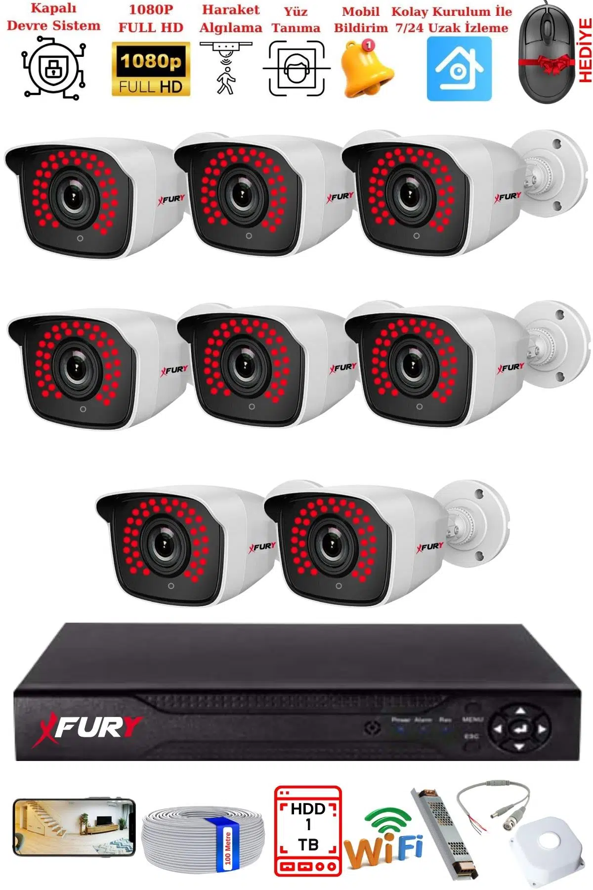 | Etiketler | FURY 8 Kamera Geniş Açı 1080P Full HD Görüntü 36 Led Gece Görüşlü-Su Geçirmez Güvenlik Kamera Seti 1 TB |
